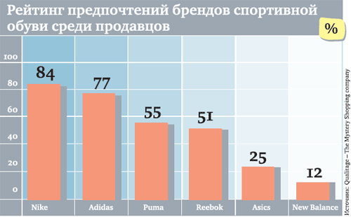 Nike можно назвать лидером – 84% продавцов назвали этого производителя, второе место занял Adidas (77%), третье поделили Puma и Reebok (55% и 51% соответственно).