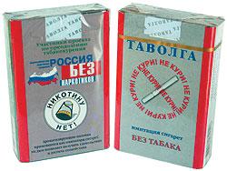 Особняком стоят "имитаторы" сигарет. Самые известные безникотиновые отечественные сигареты "Таволга" и "Ароматика" можно купить во многих табачных киосках. Довольно распространены также сигареты Nirdosh (итог 18-летних научных изысканий, основанных на законах Аюрведы). В этих сигаретах нет не то что никотина, в них нет табака. Строго говоря, от сигареты остается только привычная форма. Внутри -- хвощ полевой, трава горца птичьего, тысячелистник, пустырник, зверобой, эвкалипт. Сигареты делятся не на крепкие и легкие, а на "антистрессовые", "антитабачные", "тонизирующие", "противопростудные".