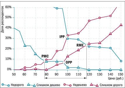 Как видно из построенного графика, границы диапазона приемлемых (RAP, range of acceptable price) цен лежат в пределах 80–115 рублей. Вне рамок этого ценового диапазона продажи скорее всего будут носить единичный характер. Точка оптимальной цены (OPP) в приведенном примере исследования – 95 рублей. Отметим, что иногда точки IPP и OPP на графике совпадают, то есть «безразличная» и «оптимальная» цены равны. В нашем примере эти две точки на графике очень близки. Однако в большинстве случаев такого наложения не происходит.