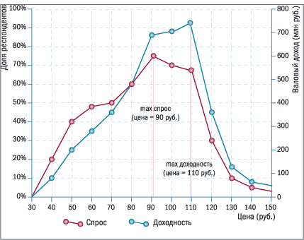 Дополнительные вопросы о покупательских намерениях позволяют определить цену, при которой спрос максимален. Кроме того, путем умножения доли респондентов, намеренных совершить покупку при определенной цене на цену продукта, мы получаем кривую валовой доходности.
