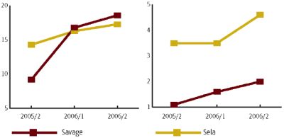 На первый взгляд исследования рынка одежды TNS Gallup выглядят несколько парадоксальными (см. графики). Savage явно лидирует в качестве узнаваемого бренда, который мечтают приобрести потенциальные покупатели. В то же время Sela твердо удерживает первенство по продажам. Однако эти перекосы вполне объяснимы, поскольку у компании Sela есть несколько преимуществ. Первое - она на десять лет раньше вышла на рынок (1990 г.). Второе - успела открыть больше собственных фирменных магазинов - около 500 против 160 у Savage. Третье - ее продукция немного дешевле по цене. Не исключено, что для потенциальных покупателей Savage еще остается актуальным вопрос - «не знаем, где приобрести». Но над этим компания активно работает, наращивая число магазинов по России и странам СНГ. Данные исследований позволяют предположить, что, пока ученые из ролика Sela «исследуют странного попугая», лицо Ксении Собчак с ее популярным телепроектом «Дом-2» и предложением «быть свободным» уверенно помогает в захвате рынка конкурентам из Savage.