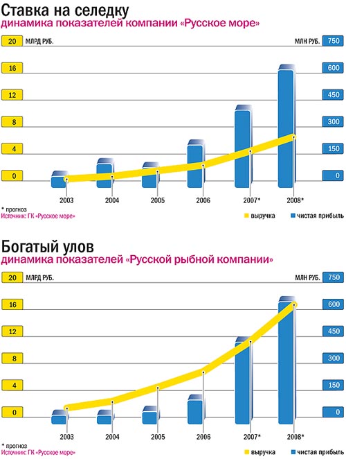 Впрочем, норвежцам стоит поспешить со своими предложениями. Руководство «Русского моря» само мечтает выйти на международный уровень. Так, открытие «дочек» «Русской рыбной компании» в странах ближнего зарубежья Дмитрий Дангауэр считает делом двух лет. А выручка всей группы по итогам 2008-го должна вырасти до $1,2 млрд. Таким образом, компания оставит далеко позади основных российских конкурентов и начнет конкурировать с международными корпорациями. У крупнейшей мировой рыбной компании Marine Harvest выручка за 2006 год, к примеру, составляет чуть больше $2 млрд. В «Русском море» считают, что через пять лет тоже смогут достичь этого показателя.