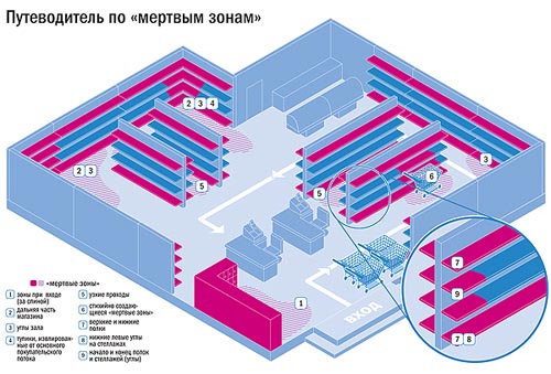 В РАЗГОВОРАХ с посторонними ритейлеры стараются избегать определения «мертвые» применительно к зонам и заменяют его нейтральным — «холодные». Но смысл тот же. В обоих случаях речь идет о зонах и полках, наименее заметных для покупателей, а значит, неудачных для выкладки товаров. Традиционно к ним относятся входные зоны, остающиеся за спиной потребителя, дальняя часть магазина (замечено, что только 40–50% покупателей заходят во внутреннюю зону магазина самообслуживания), нижний левый угол стеллажа, начало и конец полки или стеллажа, закутки и углы, узкие проходы и тупики, отделенные или изолированные от основного покупательского потока (см. схему на стр. 56). Эти зоны чаще всего остаются незамеченными покупателями, и оборачиваемость расположенного там товара гораздо ниже, чем в среднем по магазину.