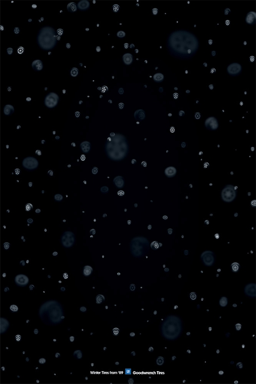 Снегопад из агентства MacLaren McCann для зимних шин GoodwrenchПри беглом взгляде на этот рекламный плакат от агентства MacLaren McCann вы видите падающий снег? Ничего удивительного, ведь это же реклама зимней резины Goodwrench от GM. Однако приглядитесь получше, ведь на принте падают не снежинки, а сами шины. Надпись: "Зимние шины начиная с '89. GM. Шины Goodwrench" Агентство: MacLaren McCann, Calgary, Canada Творческий директор: Mike Meadus Арт директор: Brad Connell, Kelsey Horne Копирайтер: Kelsey Horne, Brad Connell Фотограф: Ken Woo |