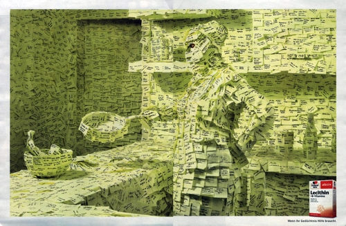 Рекламная кампания средства для улучшения памяти LecithinНет, это не реклама Post-it. Это реклама средства для улучшения памяти Lecithin. Создатели этих рекламных принтов считают, что без этого лекарства офисному работнику или домохозяйке может быть очень сложно удержать в голове всю информацию и рецепты. Надпись: "Когда твоей памяти нужна помощь." |