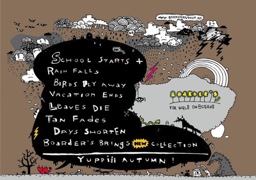 Маленькие радостиТяжела жизнь подростка. Мир похож на огромную помойную яму, населённую чудовищами. Осень пришла. Пора в школу к монстрам-учителям и монстрам-одноклассникам. И никто из них его «не понимает». Дни укорачиваются, птицы улетают на юг, листья опадают, всё вокруг так и дышит отчаянием и собирающимся холодным дождём.Но что это? В Boarder’s появилась новая коллекция! И всё забыто, подростки расчехляют свои скейты, и радостно встречают осень. И дело здесь не только в работе иллюстратора, но в совокупности всех элементов. Вместе они не просто излучают нужный посыл, но, в зависимости от индивидуальной позиции рецепиента, окрашивают его оттенками патетики или иронии. Рекламное агентство: Leo Burnett&Target, Румыния Креативный директор: Эмилиан Арсеноэй (Emilian Arsenoaiei) Артдиректор: Гика Попа (Ghica Popa) Копирайтер: Михай Ботарел (Mihai Botarel_ Иллюстратор: Гика Попа (Ghica Popa) www.leoburnett.ro KAK.RU |