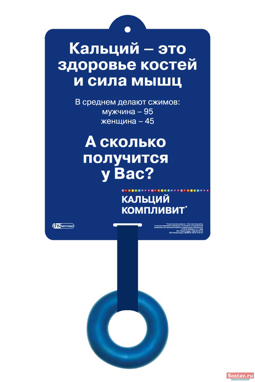 Агентство "Соус" разработало POS материалы для препарата "Кальций Компливит", позволяющие потребителям проверить свои силыС конца весны в аптеках городов-миллионников появятся мобайлы, призывающие посетителей проверить, на сколько сжимов эспандера хватит их сил. Таким способом предполагается привлечь внимание населения к препарату Фармстандарта "Кальций Компливит". В отличие от конкурентов идея коммуникации этого препарата базируется на влиянии кальция не только на крепость костей, ногтей и зубов, но и на силу мышц.Акцент именно на этом свойстве препарата должен повысить его привлекательность как для современных женщин, так и для желающих быть в форме мужчин. Мобайл, к которому крепится стандартный тренировочный эспандер, не только рассказывает о пользе кальция и среднестатистическом числе сжатий, но и побуждает посетителей аптек к действию провокационным вопросом. Состав творческой группы Фармстандарт: Управляющий отделом маркетинга и продвижения безрецептурных препаратов по РФ - Станислав Решетников Соус: Руководитель группы по работе с клиентами - Боб Костин Старший менеджер по работе с клиентами - Марианна Дьякова Директор дизайн-студии - Владимир Горшков Дизайнер: Дмитрий Макаров ![]() |