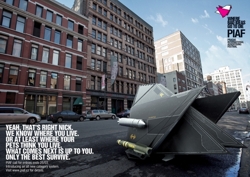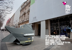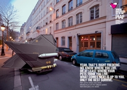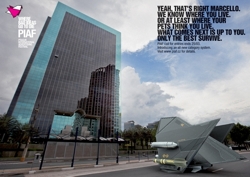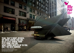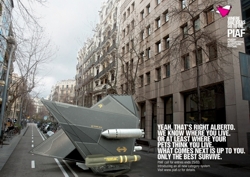 На принтах изображены штаб-квартиры агентств, около которых разместилась бронированная птичка, являющаяся символом PIAF, а также приведена личная "угроза" тому или иному креативному директору.