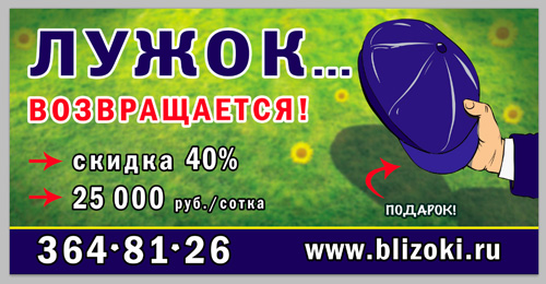 Но! Так совпало, что в это же время тогдашний мэр Москвы утратил доверие президента и был смещен с должности. В результате нам даже запретили вешать перетяжки с надписью "Поселок Лужок - кепка в подарок", и нам пришлось дарить первым покупателям бочонок меда. С тех пор прошел ровно год, и так уж совпало, что именно сейчас мы начали строительство коммуникаций. И первым покупателям участков уже с коммуникациями мы сделали специальные скидки. И, в связи с этим событием и еще одним совпадением времени, решили реанимировать прежнюю акцию с подарочной кепкой. Ну и слегка пошутили со словом "возвращается" - в память о прошлогодней "цензуре".