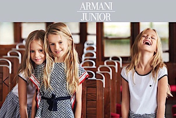 Подразделение Armani Junior представляет высокую моду из взрослых коллекций, перенесенную в одежду для подростков от 10 до 16 лет. Девочки-модели из России регулярно отмечаются брендом и становятся его лицом. Так, в феврале прошлого года лицом Armani Junior стала другая 9-летняя российская модель - Кристина Пименова, которая носит титул самой красивой девочки планеты. Тогда юной красавице досталась главная роль в рекламе весенне-летней детской коллекции бренда.