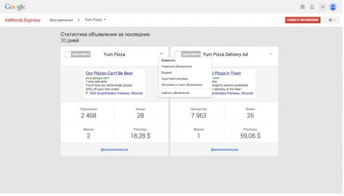 Текстовые объявления появятся в поиске Google и на картах. Когда пользователь введет запрос, он увидит объявление справа, сверху или снизу от результатов поиска с пометкой «Реклама». Автоматическая настройка кампании — главное отличие от AdWords, которая дает больше возможностей управления, а также форматов, настроек и функций. Новый сервис избавляет от необходимости выбирать ключевые слова и следить за настройками.