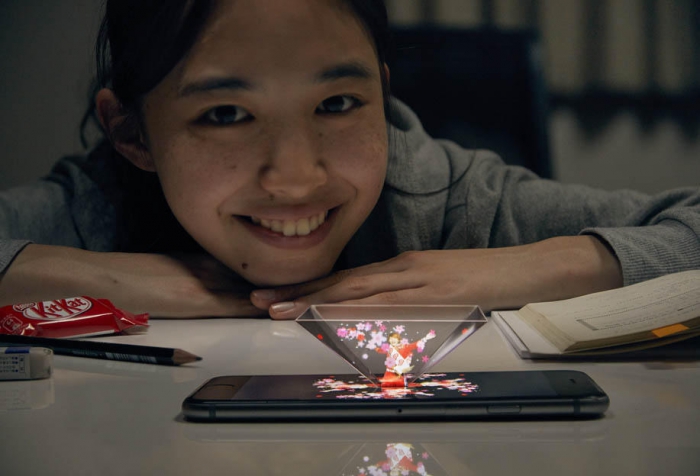 Собрав ее и включив на YouTube специальный ролик с выступлением популярной японской группы DISH, в конусе появлялись трехмерные фигуры артистов, танцуют и напевают песню со словами: "Поверь в себя! Я знаю, ты можешь сделать это". Таким образом, учащиеся получают положительные эмоции, а также чувствуют поддержку родных и близких. Сейчас необычные упаковки Kit Kat продаются во всех почтовых отделениях Японии.