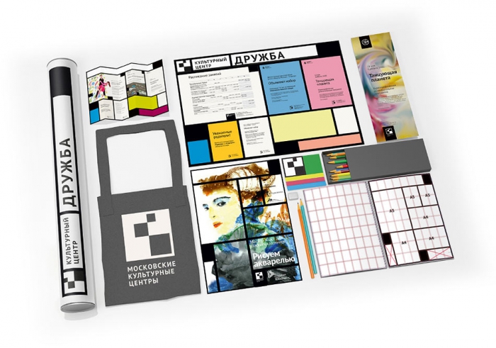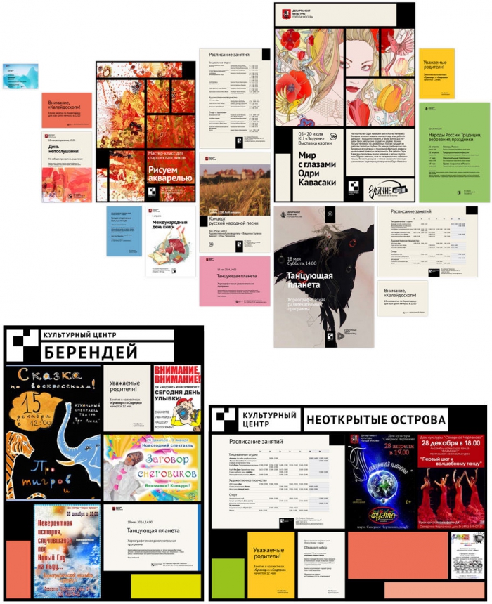 Задача. Разработать единый стиль для московских домов культуры. Департамент культуры города Москвы решил обновить столичные дома культуры и превратить их в современные центры, в которых проводятся популярные лекции, театральные постановки, концертные программы и различные занятия с профессиональными преподавателями для взрослых и детей. В студии для проекта модернизации московских культурных центров разработан фирменный стиль и созданы шаблоны информационных материалов. Логотип отдельного КЦ и объединения Московских культурных центров Горизонтальные версии логотипа Выразительный знак подкрепляется простой модульной сеткой, на основе которой строится оформление всевозможных печатных носителей. Сетка служит универсальным каркасом, который каждый клуб заполняет собственной информацией — в зависимости от направления деятельности, и при этом визуально объединяет материалы разных клубов. Рекомендации по работе с афишами, вывесками, стендами и навигацией, а также правила использования логотипа, цветов и шрифтов собраны в небольшом руководстве.
