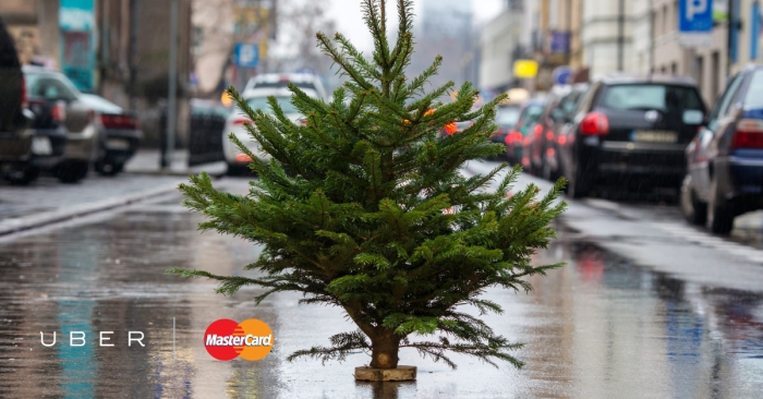 В субботу 26 декабря держатели карт MasterCard смогут заказать новогодний набор от Uber, который будет включать ёлку, подставку к ёлке и небольшой новогодний подарок.