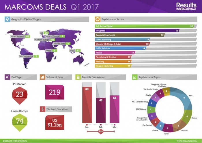 В первом квартале 2017 года было заключено 219 сделок с участием рекламных и маркетинговых стартапов. По сравнению с концом прошлого года количество слияний и поглощений (M&A) немного снизилось. В предыдущем квартале число сделок составило 238, свидетельствуют данные Results International,