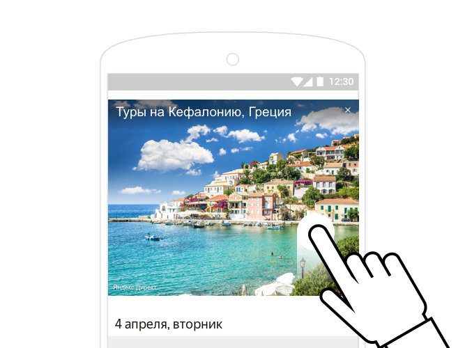 Это нефиксированный горизонтальный блок, созданный специально для мобильных сайтов. При первом контакте пользователь «считывает» заголовок и крупное изображение, а когда реклама попадает в зону видимости пользователя полностью, запускается анимация: картинка размывается и затемняется, а на передний план выходят рекламные тексты.