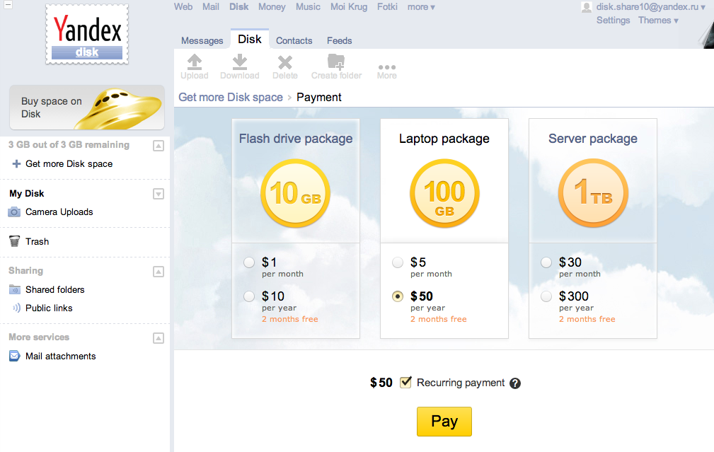 Стоимость пакета на 10 ГБ составит 30 рублей в месяц или 300 рублей в год, 100 ГБ - 150 и 1500 рублей, 1 ТБ - 900 и 9000 рублей соответственно. Российские и украинские пользователи могут оплатить услугу «Яндекс.Деньгами». Банковские карты Visa и MasterCard принимаются из любых стран, кроме того, при таком способе оплаты можно включить услугу автоматического продления.