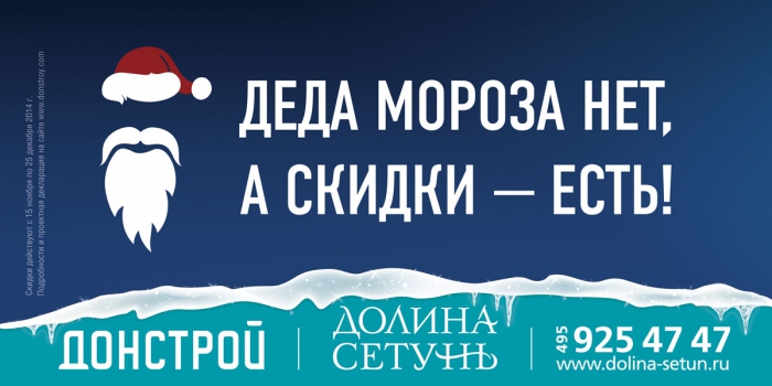Напомним, несколько недель назад в Москве и Подмосковье появились рекламные конструкции предновогодней кампании Донстрой, в которой застройщик обещает компенсировать скидками отсутствие в природе Деда Мороза. «Основное пожелание, которое высказал клиент - это качественный, возможно провокационный, юмор, заметный и яркий креатив», - рассказал креативный директор агентства AnyBodyHome! Михаил Перловский.