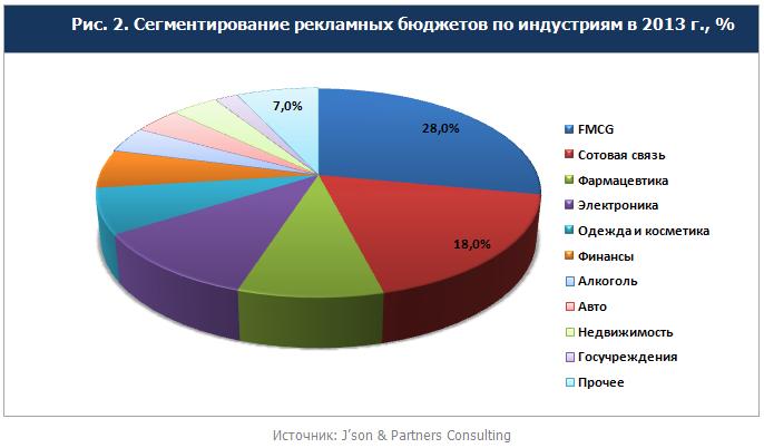 Структура интернет-рекламы смещена в сторону баннерной и иных форм дисплейной рекламы, потому что контекстная реклама как самостоятельный и значимый инструмент продвижения начала развиваться в 2012 году. По оценке J’son & Partners Consulting, в 2013 году ее доля не превышала 20%.