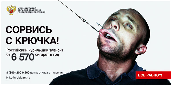 Оператор наружной рекламы Russ Outdoor при поддержке Министерства здравоохранения Российской Федерации запускает коммуникационную кампанию против курения «Сорвись с крючка!». Кампания, реализуемая в рамках социального проекта «Все равно?!», инициирована Конфедерацией обществ потребителей (КонфОП) с целью правдивого информирования российских граждан о последствиях потребления табака, в том числе об опасностях никотиновой зависимости.