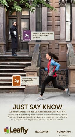 Главными героями рекламы, опубликованной на странице The New York Times стали девушка, совершающая пробежку, и мужчина. В подписи к каждому из героев отмечается, какой вид марихуаны они предпочитают, чтобы облегчить симптомы своих заболеваний.