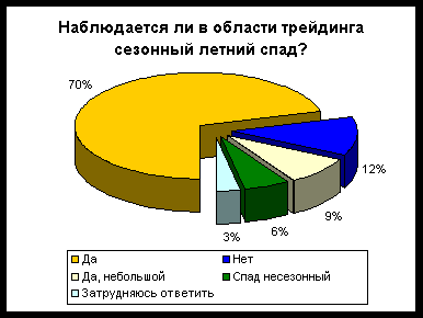 В то же время опрос среди банков и инвестиционных компаний показал совершенно иные результаты - большинство респондентов (70%) считают, что в области трейдинга есть летний сезонный спад.