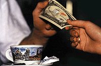 Одна из возможных промоушн-акций, которую практикует кофейня "Иония", - это распространение флаеров (в виде доллара с фирменным красным логотипом) на бесплатную чашечку эспрессо (крупный кадр с долларом) |