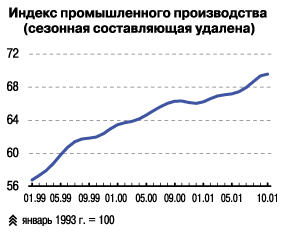 После девяти месяцев непрерывного экономического роста в октябре впервые с начала года экономический рост в России взял паузу. Два месяца, сентябрь и октябрь, объем ВВП практически не увеличивался. В октябре практически сошел на нет и среднесуточный прирост промышленного производства. В январе-октябре общий объем промышленной продукции увеличился относительно соответствующего периода прошлого года на 5,2% против 12,8% прироста за 10 месяцев 2000 года