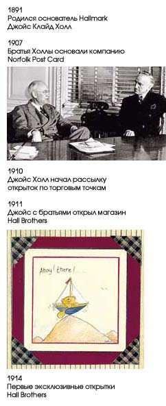 В первые годы существования компании Джойс Холл в основном делал ставку на продажу открыток, которые можно было посылать по почте без конверта. Но к 1912 году их популярность пошла на убыль, и тогда к ассортименту товаров от Hall Brothers добавились поздравительные открытки к особо важным событиям и праздникам. Такие открытки не отсылали почтой, а вручали лично, поэтому они могли быть нестандартной формы и богато оформлены.