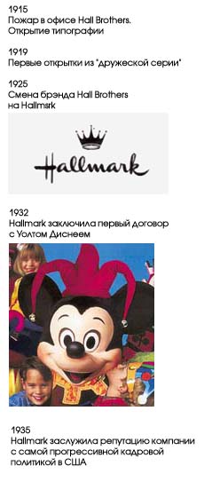 Чутье не подвело Холла и в середине 20-х годов, когда он решил поменять уже раскрученный брэнд Hall Brothers на короткое, но звучное слово Hallmark. Оно удачно сочетало в себе и фамилию основателя фирмы, и намек на высокое качество ее продукции (Нallmark в переводе с английского означает «критерий, проба, качество»). К тому времени ассортимент товаров компании перестал ограничиваться только открытками. Под маркой Hallmark выпускались бланки разнообразных приглашений, программки, календари, бумага для завертывания подарков, декоративные печати, извещения о различных событиях и т.п. В компании работали 12 штатных художников, а общее число сотрудников превысило 120 человек.