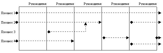 Тогда на стыках отделов проявляются не полностью совпадающие интересы смежных структур, в увязке которых эти структуры весьма заинтересованы. Результатом увязки становится работоспособный компромисс – процедуры взаимодействия, устраивающие обе стороны до тех пор, пока способствуют достижению общего результата, и пока четко соблюдаются. Нарушение сроков или качества в передаче продукта (товара, информации, услуги) от подразделения к подразделению сдвигает баланс интересов, поэтому сразу становится предметом разбирательства, инициируемого «ущемленным» отделом. То есть, как сам бизнес-процесс реализуется разными функциональными подразделениями, так и контроль за его качественным выполнением является распределенной функцией, осуществляемой подразделениями по зонам ответственности.