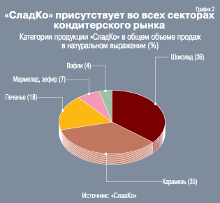С одной стороны, присутствие "СладКо" в различных нишах кондитерской отрасли - от мучного до шоколада в плитках и коробках - способно придать дополнительную устойчивость его бизнесу. И пример с "летним" рынком это хорошо показывает. Тем более что практически по всем ассортиментным позициям "СладКо" занимает высокие места в рейтингах производителей: второе место по фасованной карамели, третье - по фасованному печенью и шоколадным конфетам, четвертое - по шоколадным плиткам, шестое - по фасованным вафлям.