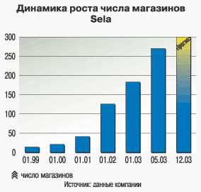 Сегодня компания Sela - лидер среди ритейлеров одежды в России как по количеству магазинов (270), так и по темпам роста их открытия (50-80% в год). Sela обгоняет таких известных игроков на рынке одежды, как "Глория Джинс", "Зарина", "Джинсовая симфония", а также многие международные брэнды. Уже в этом году Sela намерена открыть свой трехсотый магазин, а через два года - стать лидером в доступном сегменте, на 10-15% потеснив дешевый импорт из азиатских стран. |