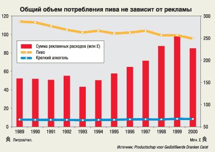 Исследования, проведенные Productschap voor Gedistilleerde Dranken Carat (см. график 1), показывают, что, несмотря на снижение рекламных бюджетов в Великобритании, наблюдается рост потребления пива. Потребление же крепких алкогольных напитков остается на прежнем уровне. Аналогичные результаты были получены и в Германии, Швеции, США. Более того, во Франции, где вводился запрет на рекламу алкогольных напитков в СМИ, тенденция такая же - постепенное снижение рекламных расходов не остановило значительный рост потребления пива и снижение потребления алкогольных напитков.