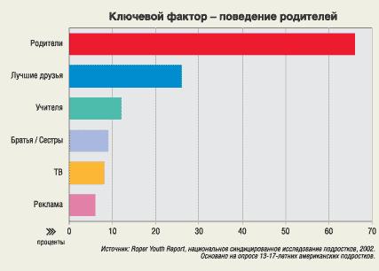 А опрос Roper Youth Report за 2002 год (см. график 2) показывает, что на решение о потреблении алкоголя в 66% случаев влияет пример родителей. Реклама же стоит на последнем месте и составляет всего 6 процентов. Таким образом, государственная политика по снижению потребления алкогольных напитков населением должна быть направлена прежде всего на проведение образовательных и пропагандистских акций. Надежды же на положительные результаты после введения запрета рекламы алкоголя, как видно из вышеприведенных исследований, ошибочны.