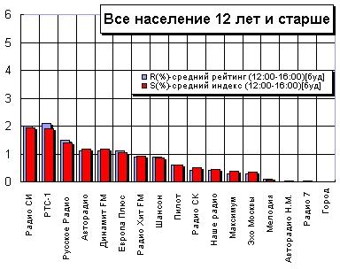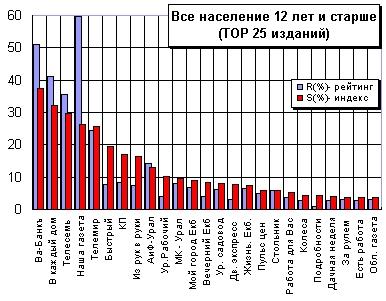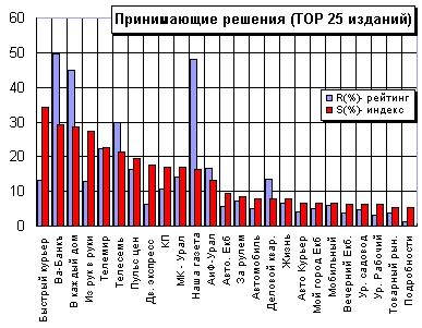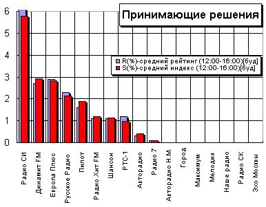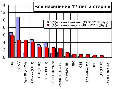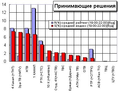 На приведенных ниже графиках индексы нормированы на соответствующую сумму рейтингов сравниваемых СМИ (СУММ S = СУММ R). Значения рейтингов и индексов для электронных СМИ: ТВ и Радио усреднялись на интервале времени 19:00-22:00 и 12:00-16:00 соответственно. Для удобства анализа СМИ мы совместили в одном графике рейтинги и индексы. Из графиков хорошо видно, что расхожая фраза: <Рейтинг - есть валюта СМИ> далеко не всегда справедлива. Действительно, если ценовая политика СМИ была бы взвешенной, тогда из условия принятой нами нормировки - значения индексов (S) и рейтингов (R) были бы примерно равны. Такое равенство мы наблюдаем лишь для Радио. Проще говоря, если мы видим, что S < R, то это означает, что цена размещения в данном СМИ завышена и, наоборот, при S > R руководство этого СМИ явно демпенгует. Это правило, конечно, не может быть распространено на рейтинги для всех целевых групп (ЦГ), поскольку всегда присутствует моменты, связанные с позиционированием формата передачи или издания под какую-либо ЦА.
