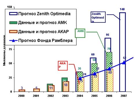 Оценка Дмитрия Ашманова, агентство mDigital Moscow: «немногим более $30 млн, в т.ч. порядка $6 млн составляет контекстная реклама. По официальным данным АКАР, объем рынка интернет-рекламы в 2003 году был $18 млн., по тем же данным рост составил 64% по сравнению с 2002 годом. Исходя из этого, мой прогноз вполне закономерен. Динамика роста, на мой взгляд, сохранилась и даже немного увеличилась. Причины объективны, устойчивый и стабильный рост рынка интернет-рекламы обусловлен общим ростом рекламного рынка России. Некоторая недооценка в среде рекламодателей и рекламных агентств роли интернета как самостоятельного медиа-канала (к слову, вполне естественная недооценка), меняется на понимание необходимости более глубокой интеграции интернет-медиа в рекламные стратегии. Более того, для многих в 2004 году наличие в медиа-миксе интернета стало обязательным и непреложным фактором эффективной рекламной стратегии. Тенденции 2004 года в 2005 году не изменятся, скорее наоборот, только усилятся. Думаю, что рост рынка составит более 70%, что даст нам по итогам 2005 года цифру превышающую $50 млн».