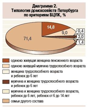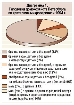 Например, на Диаграмме 1 представлена типология домохозяйств в Петербурге, построенная по параметрам (и по нашей выборке), использованным Госкомстатом при микропереписи населения в 1994 году (тогда впервые в постсоветской России в качестве учетной единицы были взяты домохозяйства).