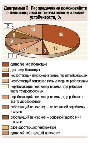 Между тем роль домохозяйств неоднозначна. Существует категория пенсионеров, которым домохозяйство ухудшает ситуацию (если никто в семье не работает). Расчет соотношения величины пенсии такого пенсионера и среднедушевого дохода в его домохозяйстве показывает, что 15% неработающих пенсионеров имеют фактический доход (среднедушевой доход в домохозяйстве) меньший, чем его пенсия. В общем количестве пенсионеров 9% "кормильцев", то есть порядка 98 тыс. человек.