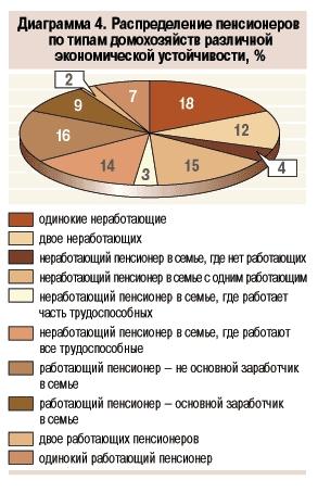 Благополучие большого числа людей (в том числе детей, которых имеют 35% таких семей) в данном случае зависит от одного человека и в целом делает эту группу (по критерию экономической устойчивости) весьма близкой к первым трем. А по численности (10% в домохозяйствах с пенсионерами и 15% среди пенсионеров) группа настолько велика, что в случае резких негативных перемен на рынке труда она может существенно увеличить долю неблагополучных домохозяйств с пенсионерами - до 78% и до 66% в общей численности пенсионеров.