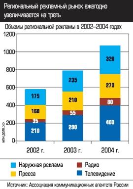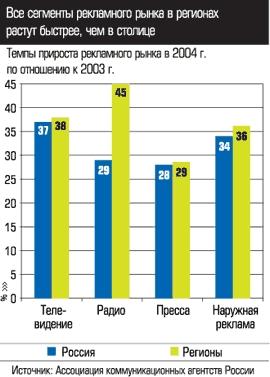 Рекламная индустрия в России на протяжении последних лет находится на подъеме. По данным экспертного совета Ассоциации коммуникационных агентств России (АКАР, бывшая Российская ассоциация рекламных агентств), объем рекламы на телевидении, радио, наружных носителях, в прессе - в 2004-м вырос по сравнению с предыдущим годом на треть, составив 3,85 млрд долларов. Объем рекламы в регионах превысил отметку в 1 млрд долларов - это 28% российского рынка. Темпы роста практически всех сегментов регионального рынка в 2004 году превысили динамику столичного.