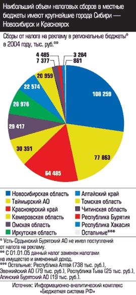Общий объем сибирского рынка составляет порядка 200 млн долларов. По оценкам экспертов, лидер здесь - Новосибирская область с объемом 70 млн долларов в 2004 году. Несмотря на существенные размеры других сибирских рынков, прежде всего Красноярского края и Омской области (35 и 30 млн долларов соответственно), их качественное развитие происходит за счет филиалов московских рекламных агентств, действующих в сегменте наружной рекламы и медиабаинга (размещение рекламы в СМИ).