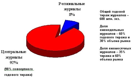 В отличие от газет, подавляющее большинство журналов (91,6% наименований и 98% совокупного годового тиража) зарегистрированы и выходят в свет в Москве и Санкт-Петербурге. Таким образом, российские столицы определяют структуру журнального рынка страны практически полностью, а его "ядро" вообще составляют около 600 журналов общего спроса с совокупным годовым объемом в 62 млрд. полос и тиражом свыше 500 млн. экземпляров (см. Диаграмму 1).