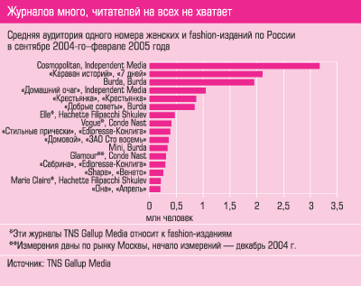 Между тем большинство российских женщин среднего класса, похоже, особой разницы между журналами не видит, а устанавливаемый ими стиль жизни своим не считает. Об этом говорили опрошенные нами ненаучным порядком, так - интереса ради, потенциальные или реальные читательницы женских журналов. Об этом косвенно свидетельствуют данные исследования "Средний класс", проведенного под эгидой "Эксперта" осенью 2004 года. Так, самые популярные у "средних русских" Cosmopolitan и "Караван историй" читают лишь 23% и 16% респондентов соответственно, у других изданий читателей еще меньше. Об этом говорят и показатели AIR (средняя аудитория одного номера), рассчитываемые TNS Gallup Media: лишь 27,6% всех российских женщин в возрасте от 18 лет читает женские журналы. А в тех же США 70,1% представительниц прекрасного пола листает женскую прессу.
