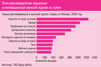 Традиционному "женскому" рекламодателю интереснее охват аудитории, и потому он скорее пойдет в не обремененный интеллектом, зато тиражный Cosmopolitan. А нетрадиционного рекламодателя сложно привлечь из-за устойчивого представления о том, что реклама профильных продуктов должна размещаться в профильных журналах: если банковские карты, то непременно в деловых изданиях, если мужская одежда - то в мужских журналах и т. д.