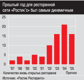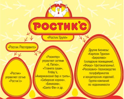 Ресторанный холдинг "Ростик Ресторантс" входит в корпорацию "Ростик Групп" (см. схему ниже) и работает на российском рынке с 1990 года. Холдинг объединяет несколько сетей семейных ресторанов под торговыми марками "Il Патио", "Планета суши", Friday`s, "Американский бар и гриль", "Мока Лока", "Сибирская корона", "Санта Фе", "Кафе Дез Артист", "Бенихана" и др. - всего более 200 ресторанов. В сегменте фаст-фуд "Ростик Ресторантс" владеет сетью ресторанов "Ростик`с". Годовой оборот всей корпорации "Ростик Групп" в 2004 году составил 200 млн долларов, из них 146 млн пришлось на "Ростик Ресторантс". Планируемый оборот "Ростик Ресторантс" в этом году - 200 млн долларов. |