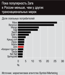 Брендированные компании, работающие в массовом сегменте российского одежного рынка, пока беспокойства по поводу экспансии Zara в нашей стране не проявляют. Российские игроки - "Первомайская заря", O`stin, Savage, Oggi - объясняют это тем, что они не являются прямыми конкурентами испанской компании прежде всего потому, что работают в более дешевой ценовой нише. Если стоимость среднего чека покупки в Zara составляет около 80 долларов, то в магазинах российских производителей она, как правило, не превышает 50 долларов. Работающие же в аналогичной с Zara ценовой категории транснациональные игроки утверждают, что масштаб их присутствия в России пока несопоставим с довольно-таки ограниченным присутствием Zara: сегодня все они имеют десятки магазинов в различных регионах России. Только за текущий год компания Benetton открыла пятнадцать магазинов, Mexx - одиннадцать, Naf-Naf - около десятка. "Чтобы мы почувствовали конкуренцию с Zara, нужно, чтобы их магазинов было как минимум в десять раз больше", - говорит Андрей Григорьев, глава представительства компании Benetton в России.