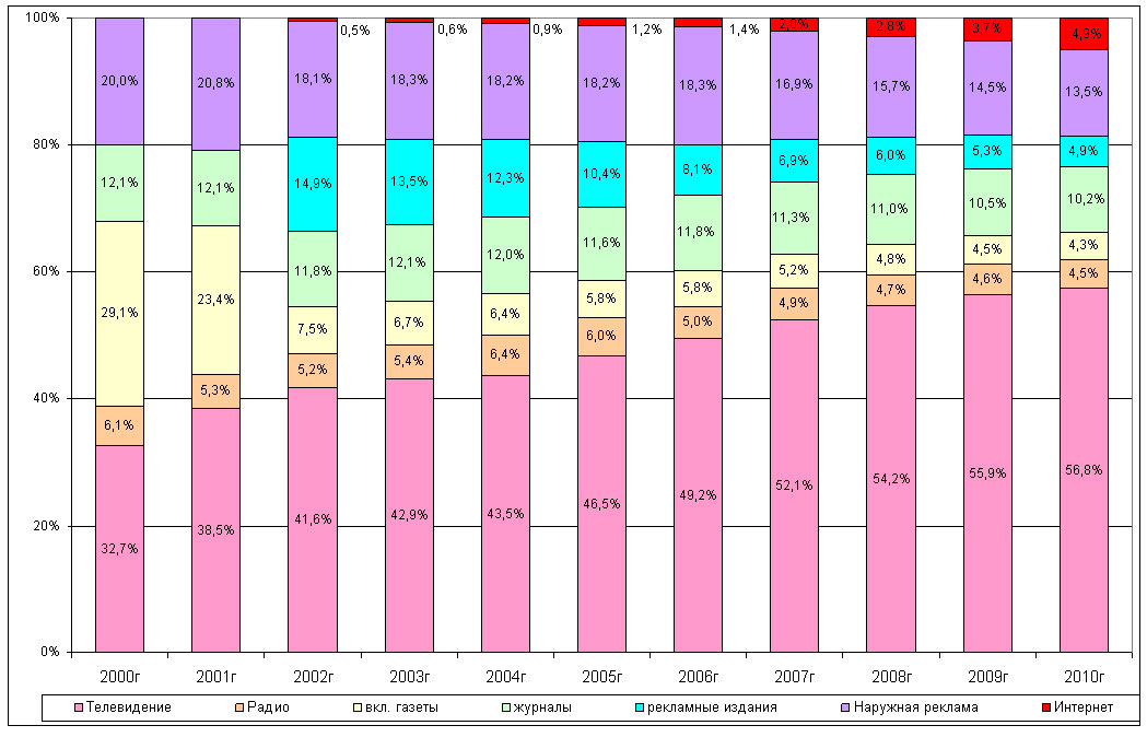 График 1. Динамика бюджетов различных медиа в общем бюджете российского рекламного рынка 2000 – 2005, и прогноз до 2010 года.