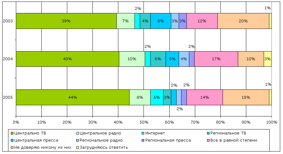 Согласно всероссийскому исследованию холдинга Romir Monitoring, проведенному в августе 2005 года[2], более всего респонденты доверяют центральному телевидению – 44% опрошенных (график 2).
