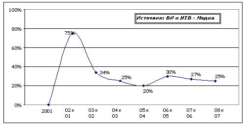 Начиная с 2002 года медиаинфляция на ТВ постепенно снижалась, однако, по прогнозам ВИ и «НТВ – Медиа» в 2006 году ожидается повышение цен на ТВ - рекламу на 30%. Это связано с отсутствием возможностей для количественного увеличения объема рекламы, поэтому рынок растет за счет цен. Подъем цен сразу на 30%, по мнению ВИ и НТВ – Медиа, поможет уровнять предложение и спрос, растущий несоизмеримыми темпами. Согласно предварительным результатам за 2005 год спрос вырос на 36,5%, а предложение со стороны ТВ-каналов только на 7,8%.